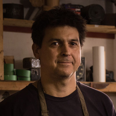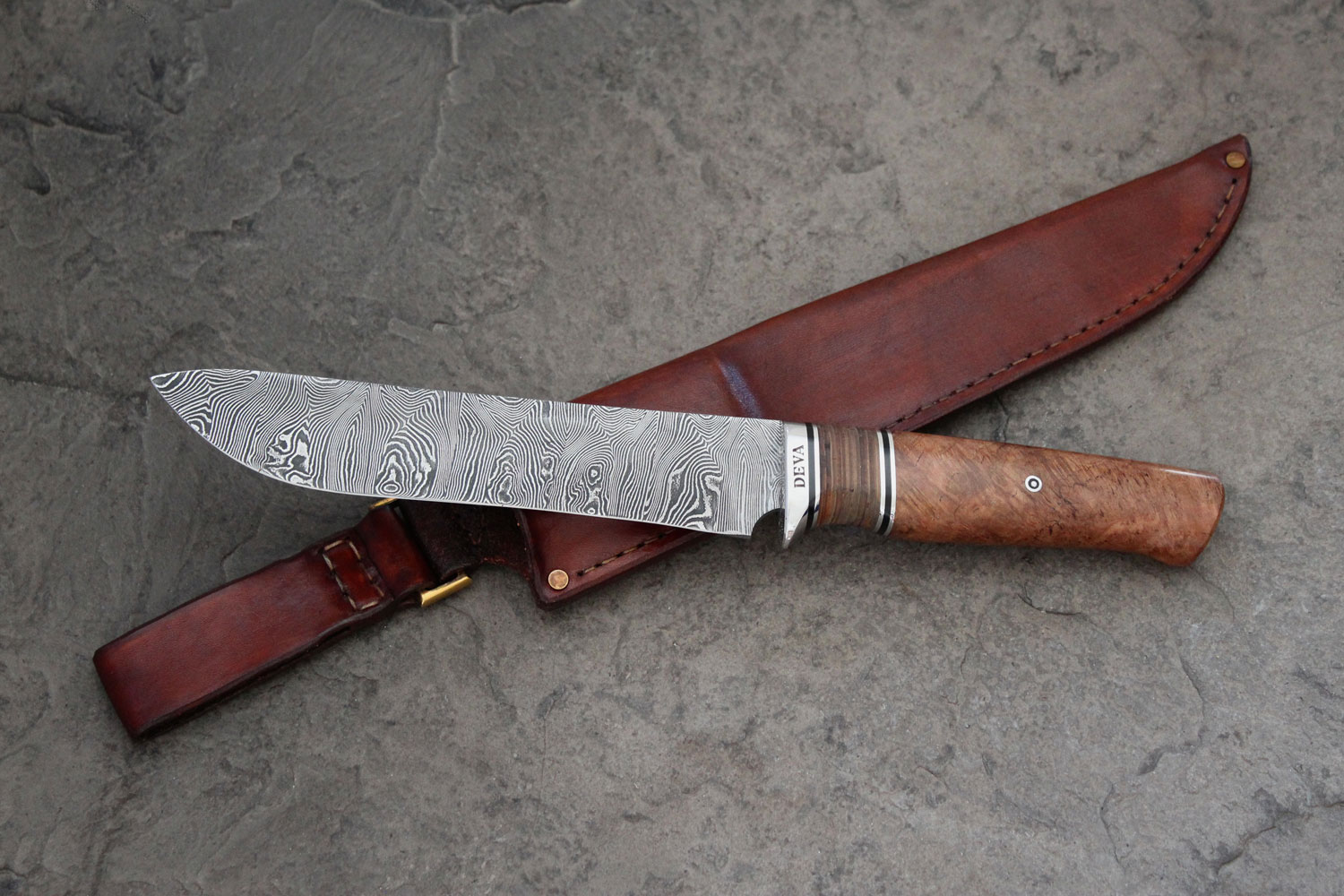 This large hunting knife features a Damascus carbon steel blade with an organic pattern, shaped with a convex curve that transitions into a concave edge. The handle combines laminated birch bark, stabilised cherry burl, stainless steel and G10. The dyed, moulded leather sheath is fitted with a movable belt loop mounted on a brass ring.