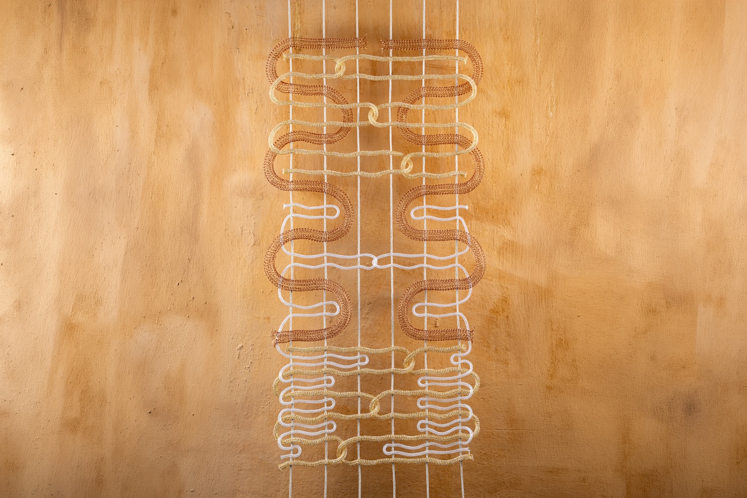 This woven sculpture was created during Homo Faber Fellowship 2025/26 by weaver Morgane Baroghel-Crucq based in France, and French fellow Maëva Louvel. Inspired by the Moirai, the ancient Greek Fates who weave the thread of life, this wall hanging is made by knitting enamelled copper threads into ‘tubes’ of different sizes and colours, which are then woven on a loom to create a pattern.
